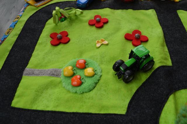Auf jedes Viertel des Autotepppichs kam etwas anderes. Den Obstgarten nutzen wir zum Zählen üben: es sind 1 Schmetterling, 2 Erdbeeren (unter den Blättern versteckt), 3 Blumen und 4 Äpfeln.