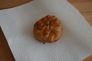Sobald Beljashi goldbraun gebraten sind, von der Pfanne nehmen und kurz auf die Papierhandtücher legen (sie nehmen das Restöl auf).