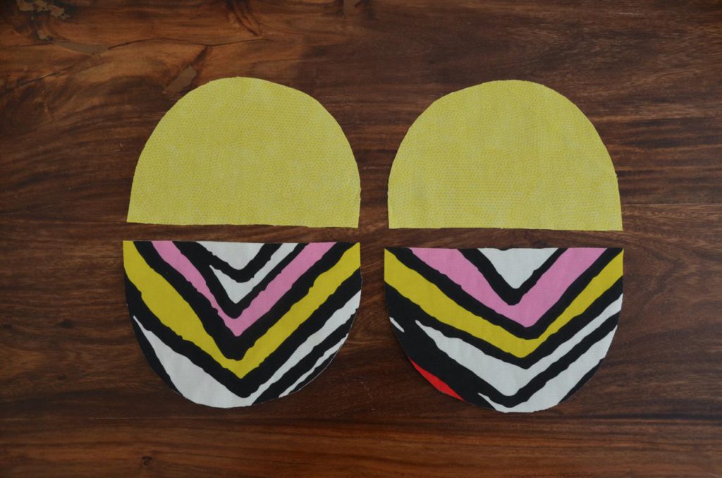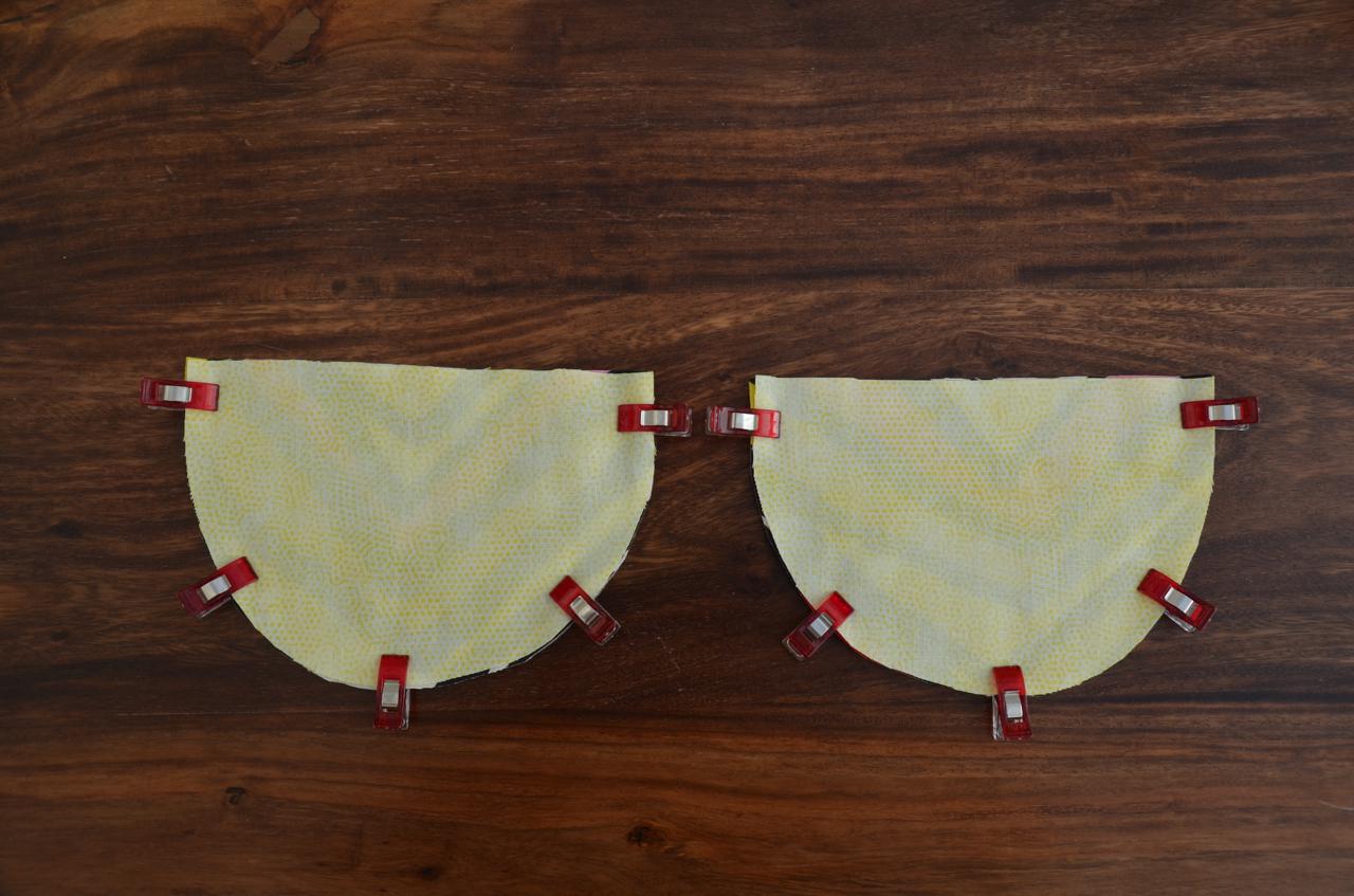 Diese werden rechts auf rechts auf einander gelegt und gesteckt.  Anschliessend näht man diese an der gerundete Seite zusammen.